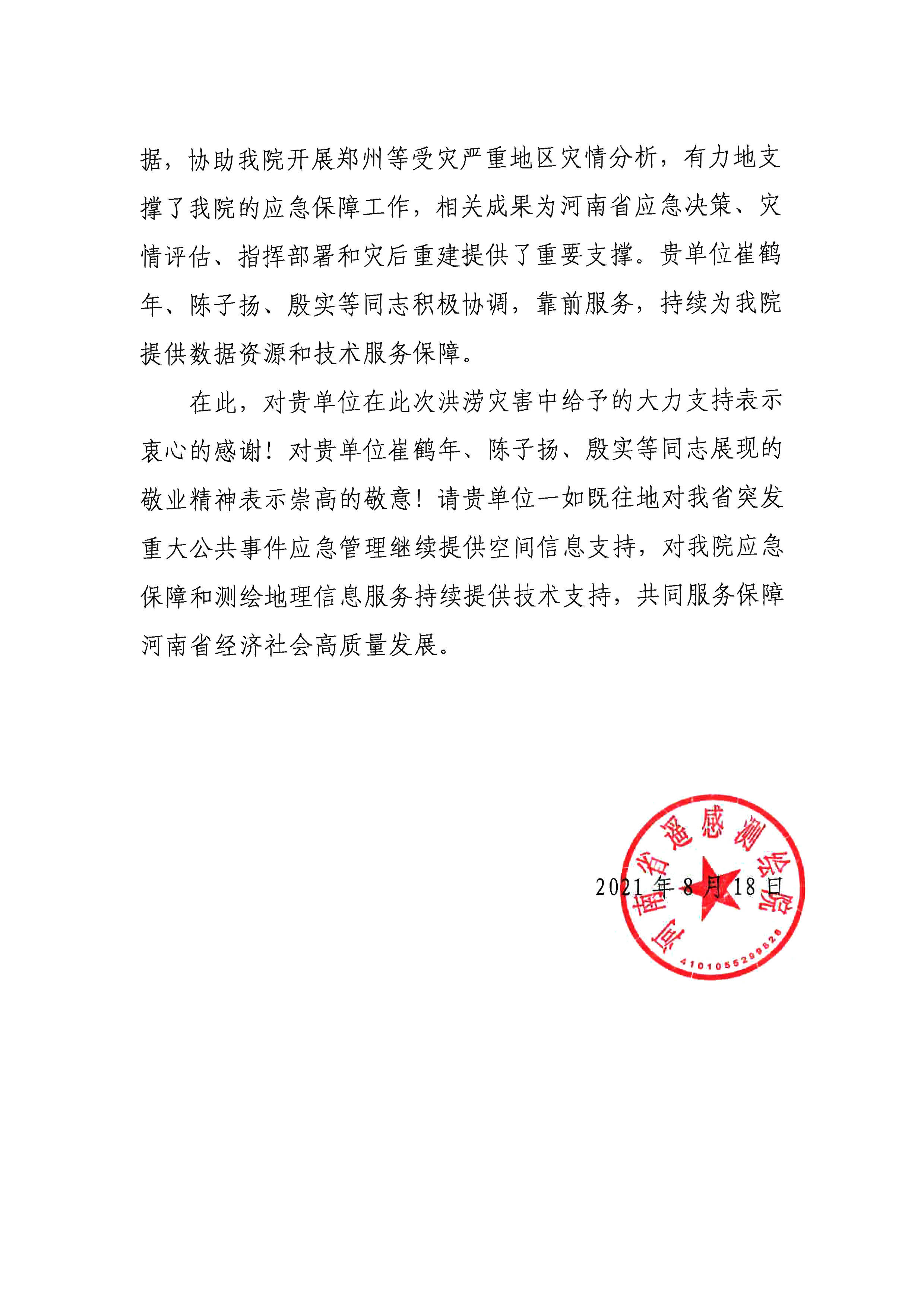 在感謝信中,河南省遙感測繪院希望國遙新天地在未來能夠一如既往地對河南省突發(fā)重大公共事件應(yīng)急管理提供強(qiáng)大的空間信息支持,同時(shí)也對應(yīng)急保障和測繪地理信息服務(wù)提供持續(xù)的技術(shù)支持。