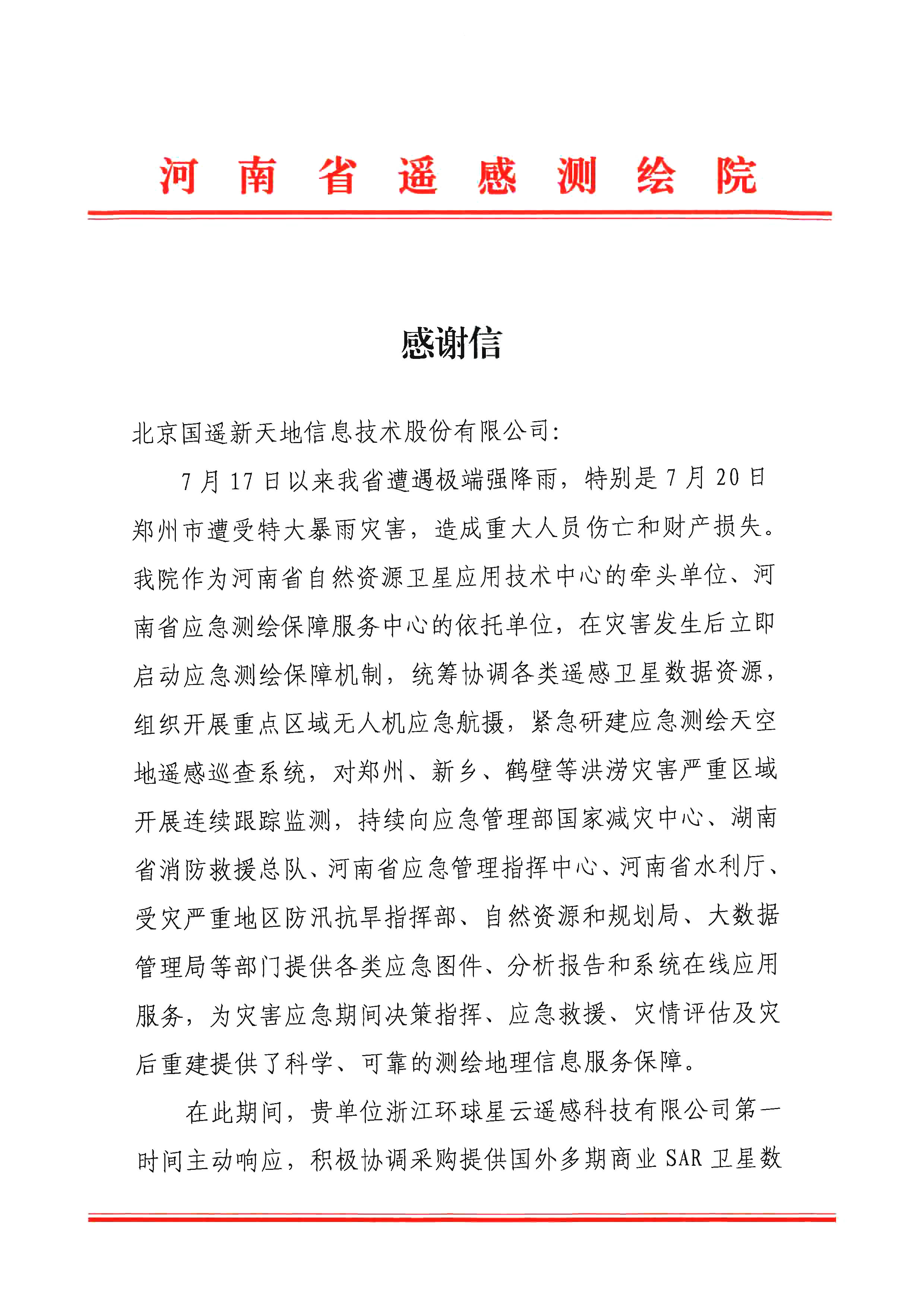 近日,河南省遙感測繪院發(fā)來感謝信,對國遙新天地及子公司浙江環(huán)球星云遙感科技有限公司(簡稱“環(huán)球星云”)在河南省“7·20”暴雨洪澇災(zāi)害應(yīng)急中提供的有力支持表示衷心感謝。